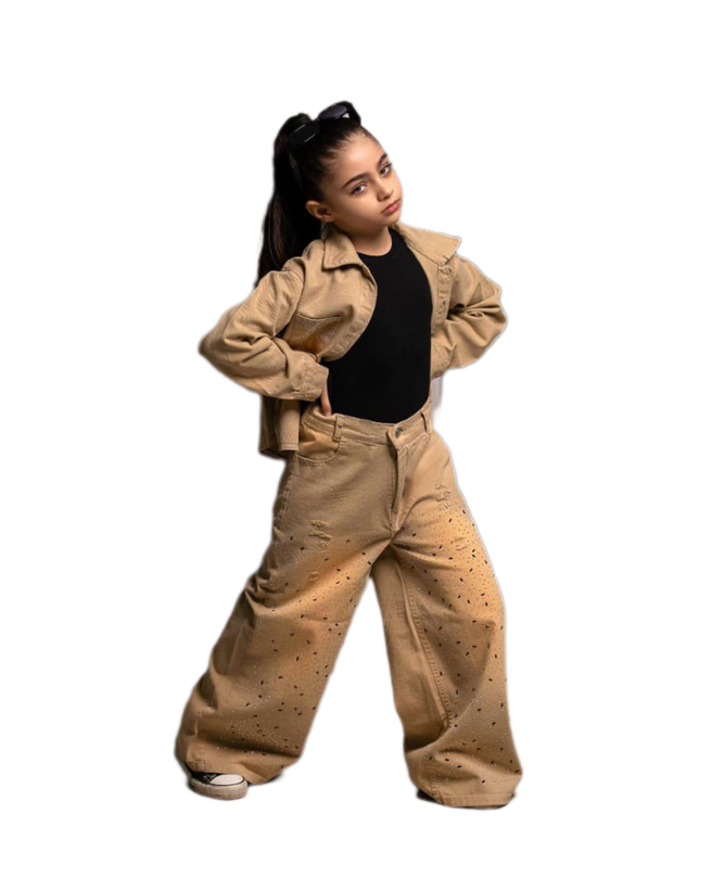 دوخت تمیز و بسیار شیک پارچه جین خارجی با نگینهای ظریف مناسب ۸ تا ۱۳ سال.